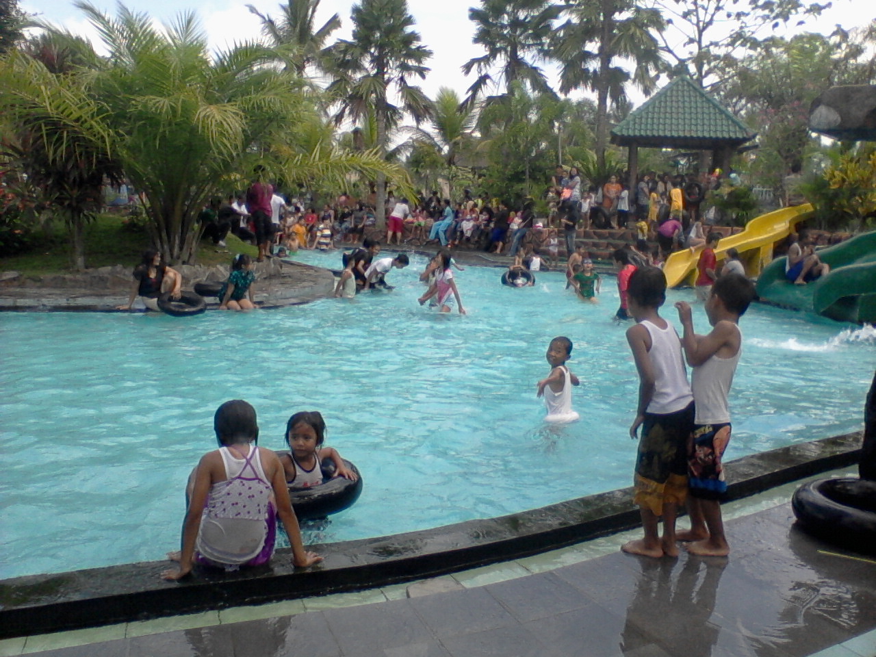 Bagi yang tidak ingin basah kuyup bisa menikmati waktu bersantai di pendopo yang disediakan pihak pengelola di sekitar kolam yang ada di sana. Gazebo ini juga terlihat sangat nyaman karena dilengkapi dengan atap untuk melindungi Anda dari terik sinar matahari. Bagi anda yang ingin rehat sejenak, tersedia juga jajanan yang dibawa dari rumah.